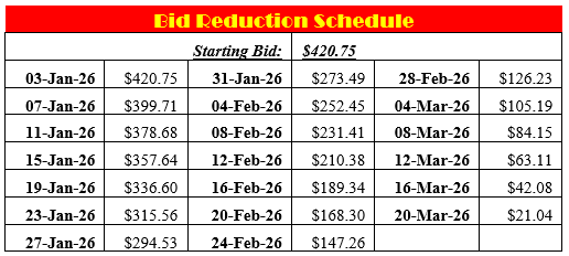 This Dutch auction began on January 3rd, 2026, at $420.75. It will be reduced by 5% every four days according to the Bid Reduction Schedule below.